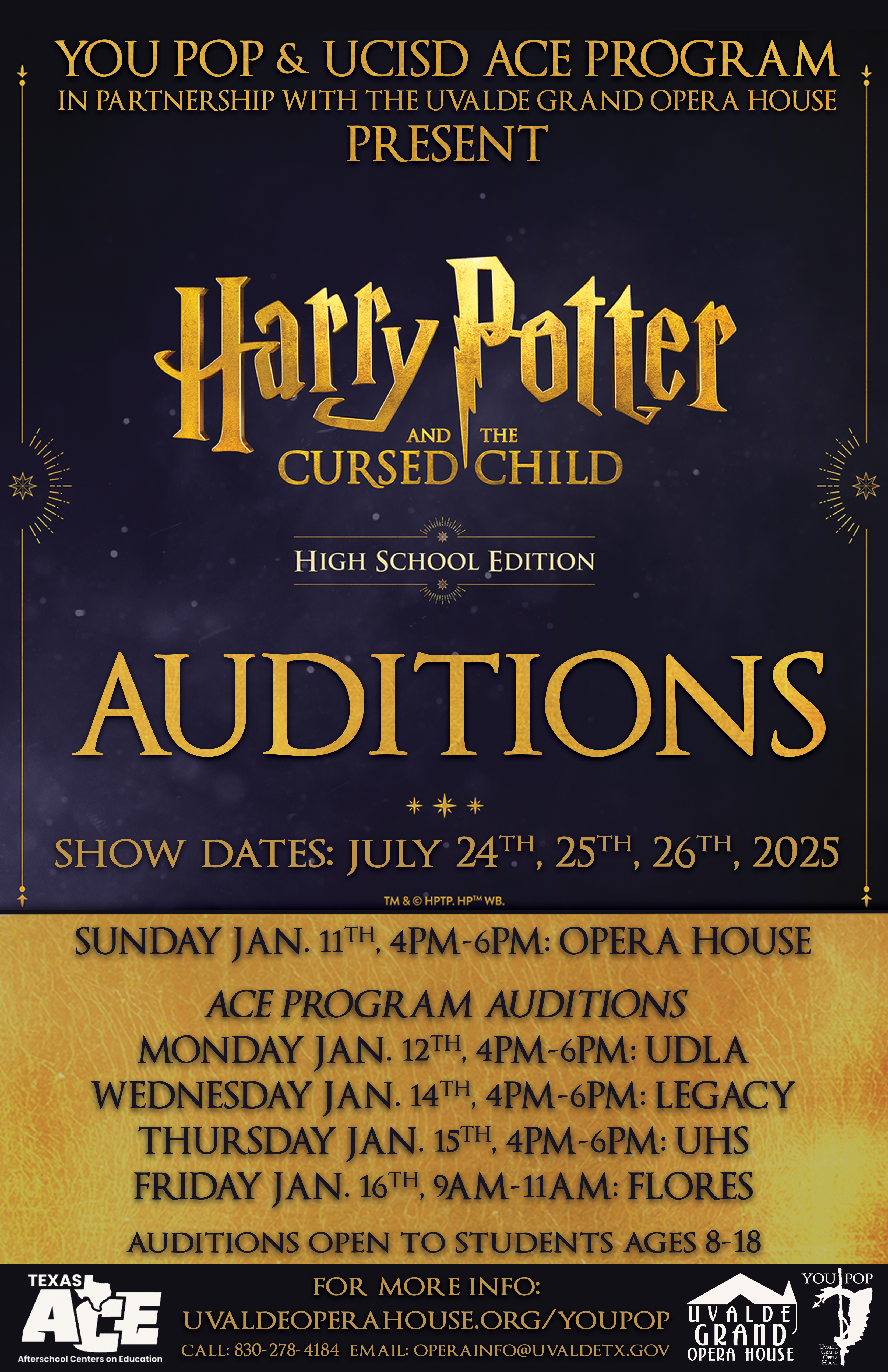 Our summer youth theater program, You POP is open to any students in the area ages 8-18. Students ages 10-18 will be eligible for speaking parts, students must have turned 8 years old by the start of the program, June 15th. All 8-9 year old students will be cast as Hogwarts Students, as well as witches and wizards in Hogsmeade. No speaking parts will be given to any child under the age of 10.